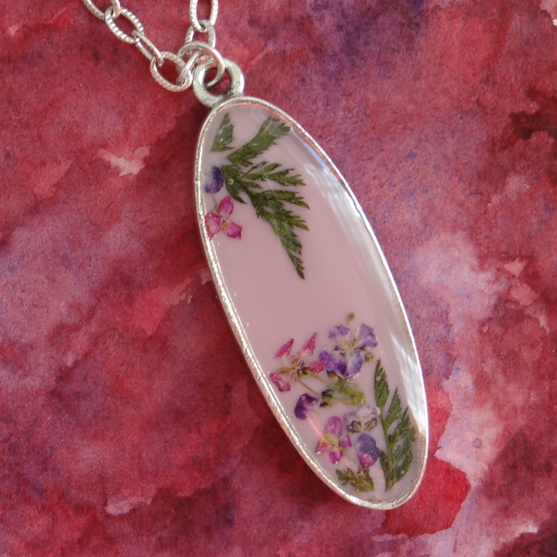 Lilás, rózsaszínes gyantaháttér emeli ki a mézvirágok bájos színeit, egy-egy különlegesen csipkézett mezei levéllel.