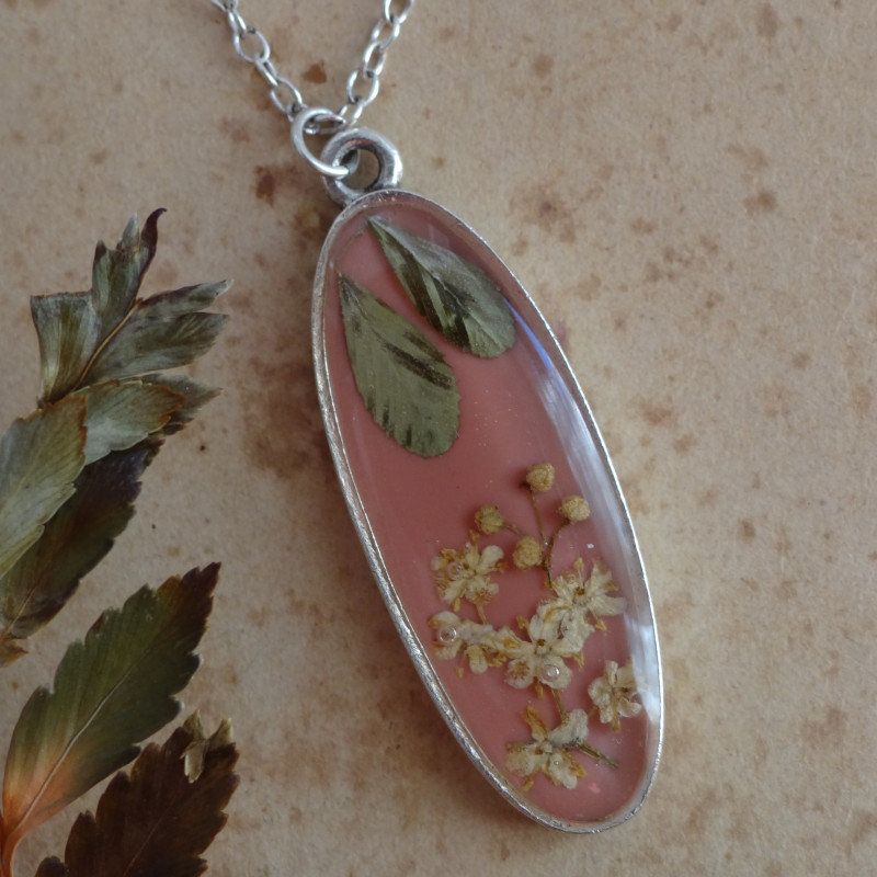 Kicsit fáradtabb, vintage hatású színek találkoznak ebben a medálban: a mezei levelek zöldje töri meg a bodzavirágok és a barackos gyantaháttér álmatag összképét. Csendesen megnyerő, nem hivalkodó ékszer, mely sok árnyalathoz illeszkedik.