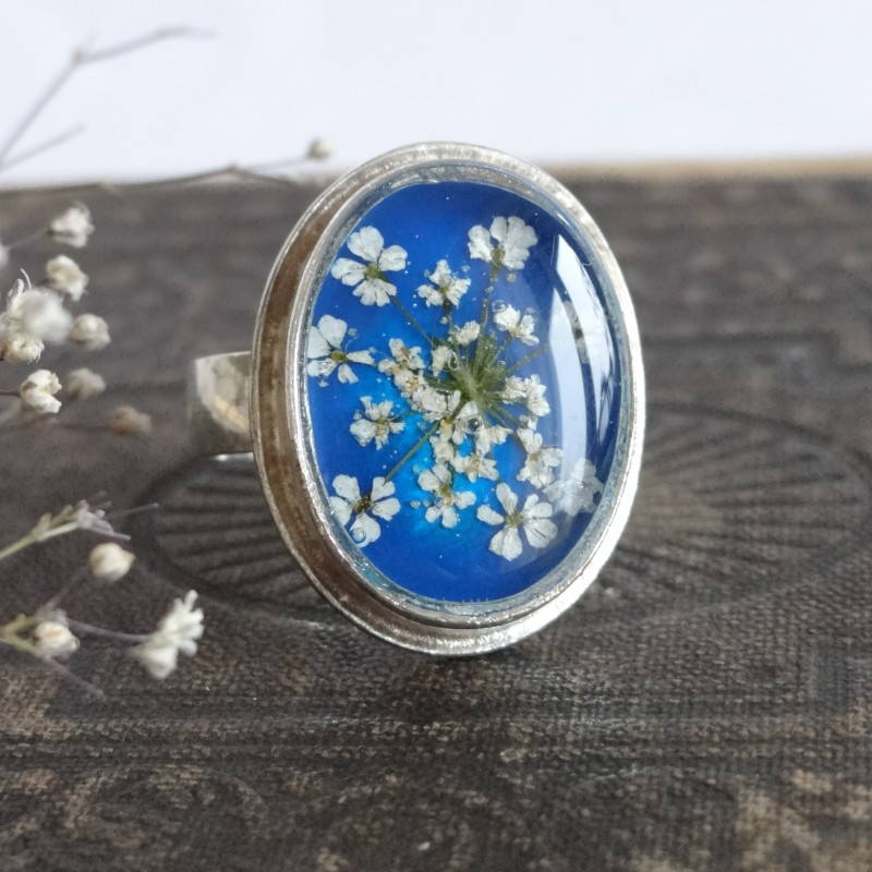 Megkapó kék gyantaháttéren csipkeszerűen terülnek el a turbolya apró virágai. Az ezüstözött gyűrűalap szépen kiemeli a kék elegáns árnyalatait.