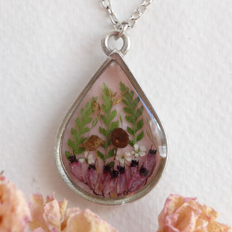 Eső utáni rét kis szeletét foglaltam medálba. A hangavirágok és turbolyák koszorújából apró gombák magasodnak fűszálak és páfránylevelek árnyékában. Finoman csillámló, rózsaszínes gyantaháttér emeli ki a természet apróságainak szépségét.