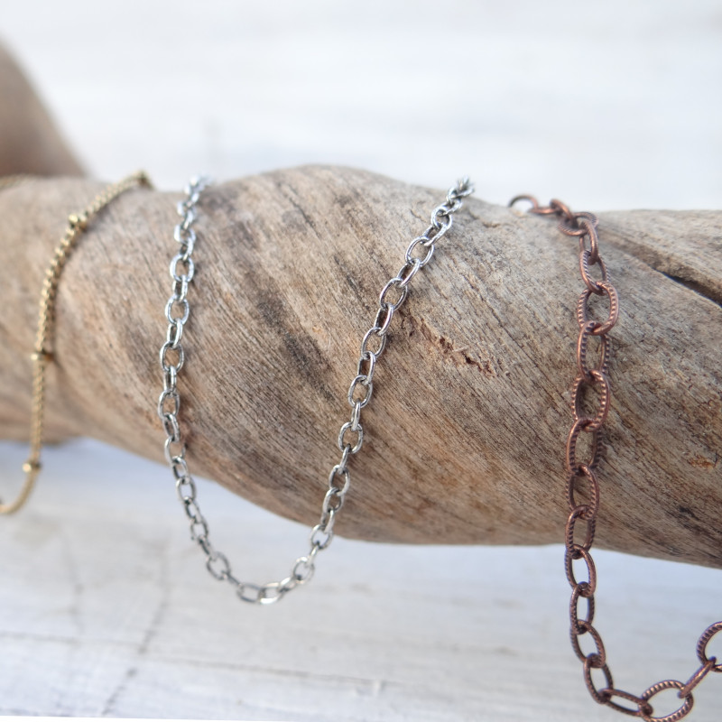 lánc: 50 cm hosszú, 3 x 1,5 mm-es finom textúrájú szemekkel. Antik ezüst (999 ezüst) bevonattal ellátott sárgaréz.