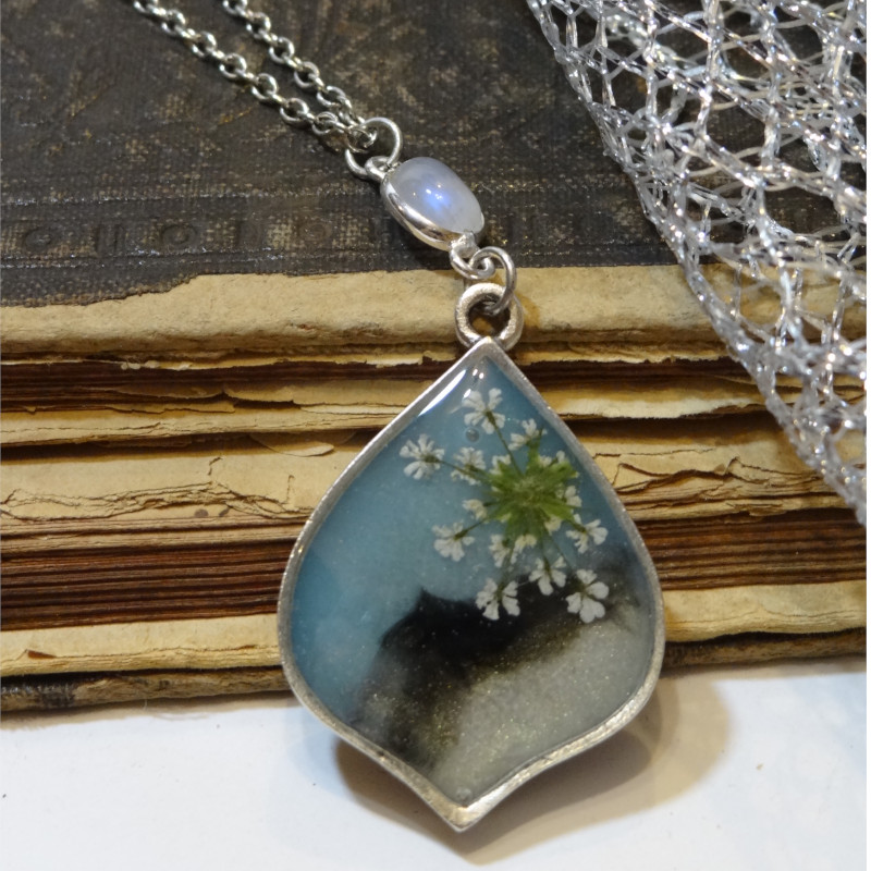 A nyakláncot a fényben kékesen megcsillanó szivárvány holdkőre komponáltam. Az ásvány árnyalataira rímelnek a medál csillámló kékes és ezüstös színei. A kontraszt kedvéért némi fekete teszi hangsúlyossá az ékszert. Ebbe a háttérbe belesimul az erdei turbolya csipkeszerű virágzata.