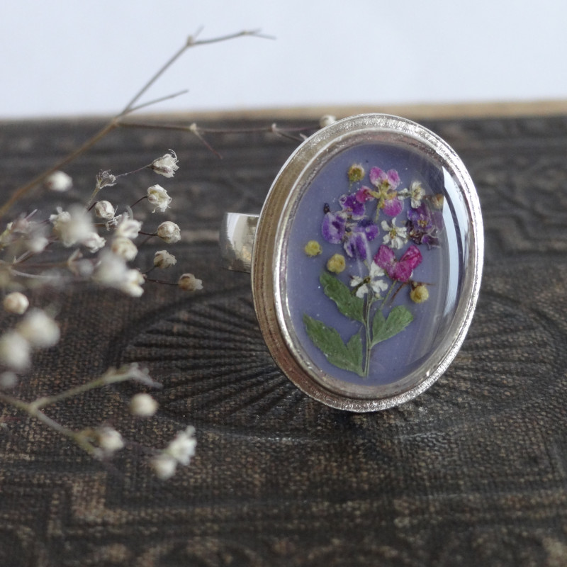 Mézvirágok, turbolya, bodzabimbók és egy páfránylevél alkotja ezt a miniatűr csokrot. A lilás gyantaháttér szépen harmonizál az ezüstözött alappal.
