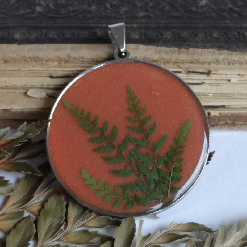 Páfrányleveleket foglaltam egy csokorba ebben a narancsos hátterű nemesacél medálban. Egyszerűségében szép ékszer.