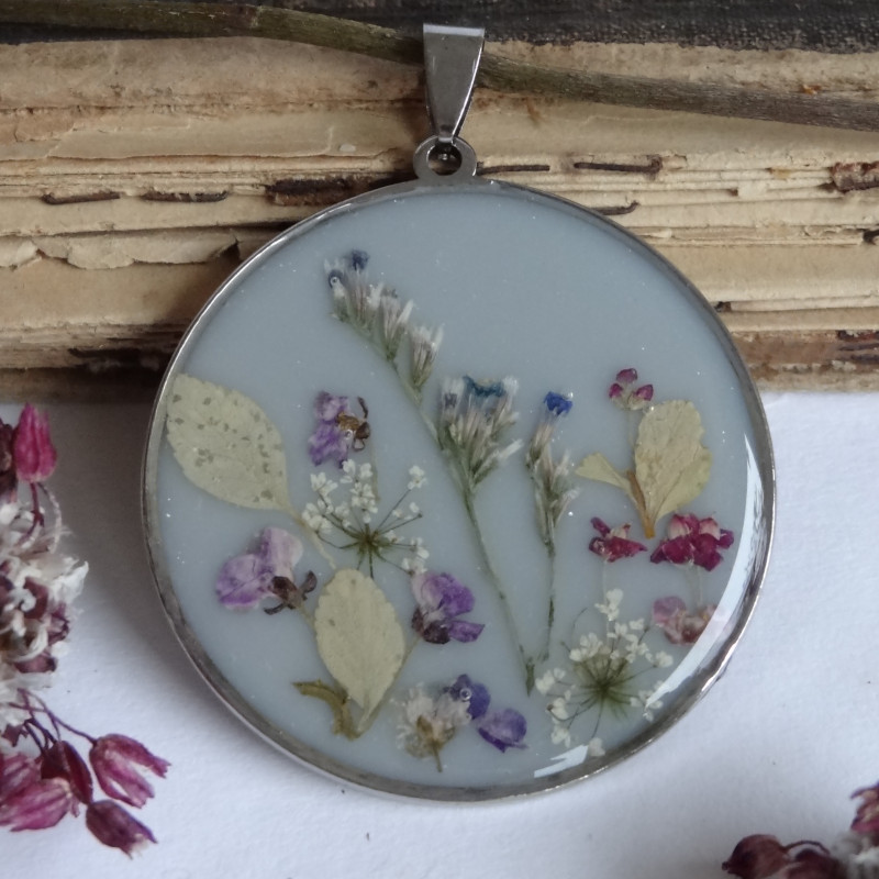 Mézvirágok, turbolyák, levelek alkotnak egy mini rétet ebben a szürkés hátterű nemesacél medálban.