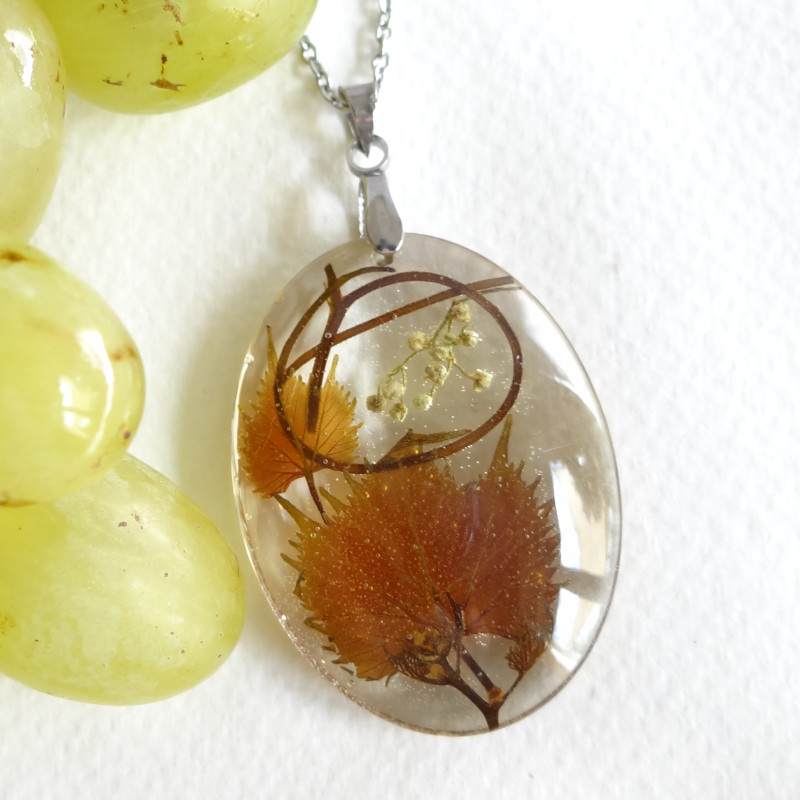 Szőlőleveleket és indákat rejt az ökogyanta medál. A szőlőfürtöt apró bodzabimbókból alkottam meg.